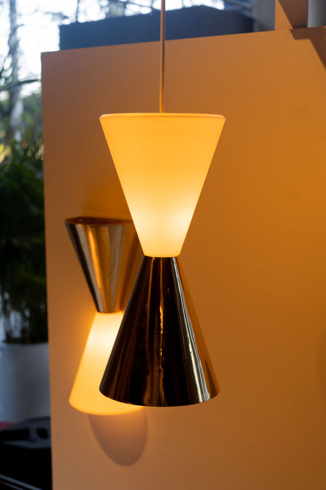 As Luminárias Tempo surgem do contraste das técnicas da fundição em caixa de areia e impressão tridimensional e da forma como tais materiais se relacionam com a luz. A fundição, como técnica ancestral que permite moldar metais, se contrapõe à impressão tridimensional, tecnologia recente que permite criar superfícies com grande liberdade plástica e, como nesta luminária, translúcidas. Formalmente, é constituída por dois cones opostos, como uma ampulheta. Um deles sendo a base, translúcido, em bioplástico de milho, e o outro como cúpula em latão fundido, polido externamente. Ao ter sua base iluminada, subverte a lógica comum em que ela apenas sustenta uma cúpula. A rugosidade da face interna da peça fundida, marca do processo artesanal, é evidenciada pela luz do encontro entre os dois cones.